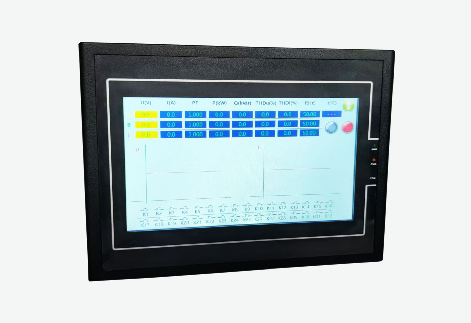 觸摸屏無功補償控制器以高速數(shù)字信號處理器為核心,采用交流取樣,人機界面為7寸點陣大屏幕液晶觸摸顯示器,其具有配電監(jiān)測、無功補償、諧波分析。具備多種保護功能,報警輸出功能;可檢測柜內(nèi)溫度,并啟動散熱風機(定制);并可監(jiān)測開關狀態(tài)。